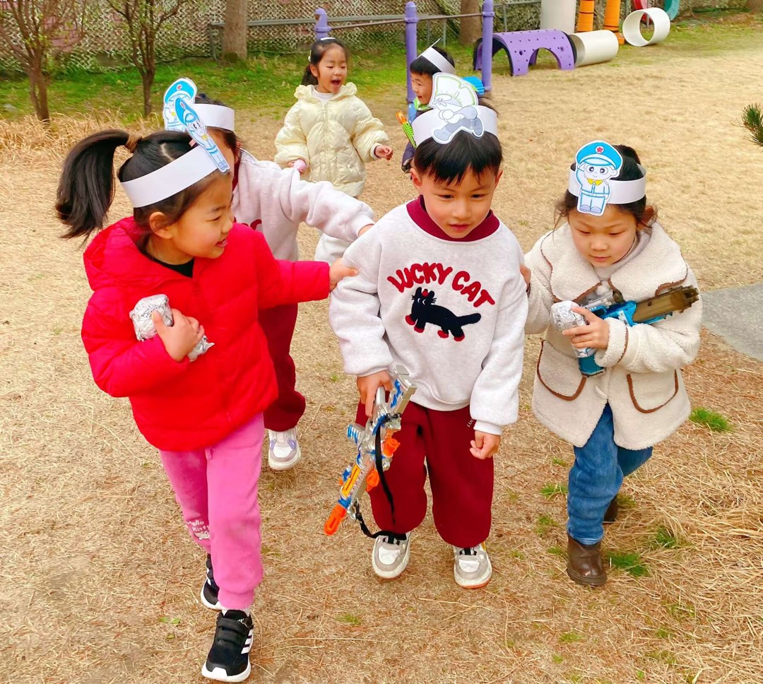 在野战区游戏中,小朋友们开展了一场趣味十足的“警察抓小偷”游戏。根据自己的意愿选择了相应的角色头饰,并兴致勃勃地投入游戏。在游戏过程中,扮演“警察”的小朋友们手持玩具枪和自制“炸弹”,认真履行职责,努力搜寻与抓捕“小偷”;而扮演“小偷”的幼儿则机灵地东躲西藏,试图躲避追捕,最终寡不敌众被抓获。游戏中的他们在户外场地中奔跑穿梭,欢声笑语回荡在空气中。此次游戏不仅锻炼了幼儿的身体协调性和反应能力,还让他们在角色扮演中理解规则与责任,增强了团队协作意识和社交能力。同时也让幼儿在轻松愉快的氛围中收获了快乐与成长。