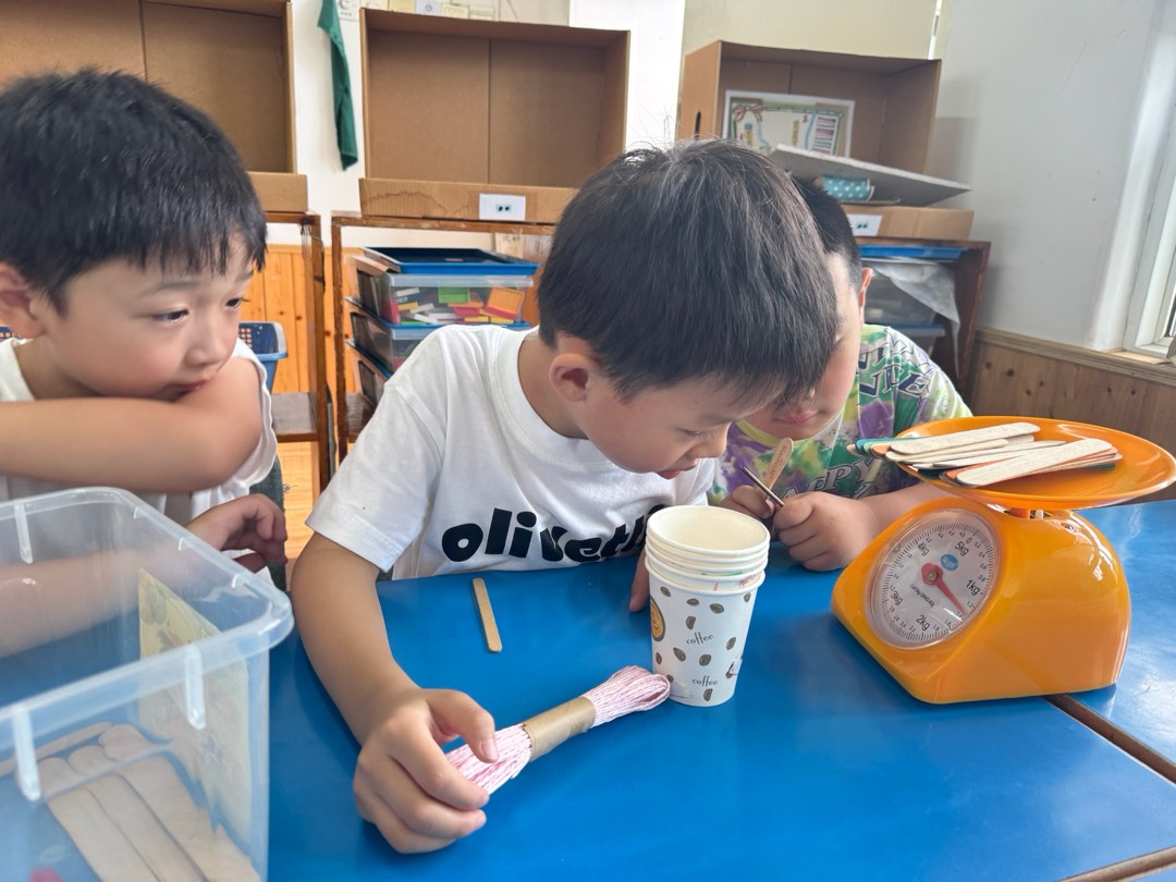 在科探区,一场关于“称一称”的趣味探索正在热闹进行中,活动中,孩子们围在秤旁,眼神里满是好奇。他们小心翼翼地把纸杯、木棍等物品放上秤盘,盯着刻度指针的转动,嘴里念叨着数字,认真对比不同物品的重量 。操作时,宥廷发现物品摆放位置会影响指针,反复调整进行对比,子恒和景康铭争论谁选的物品更重,在交流里明晰重量概念。
