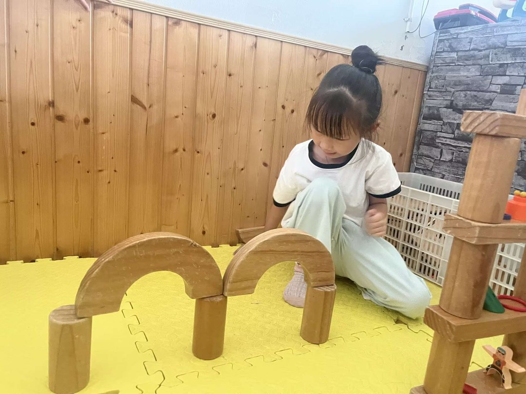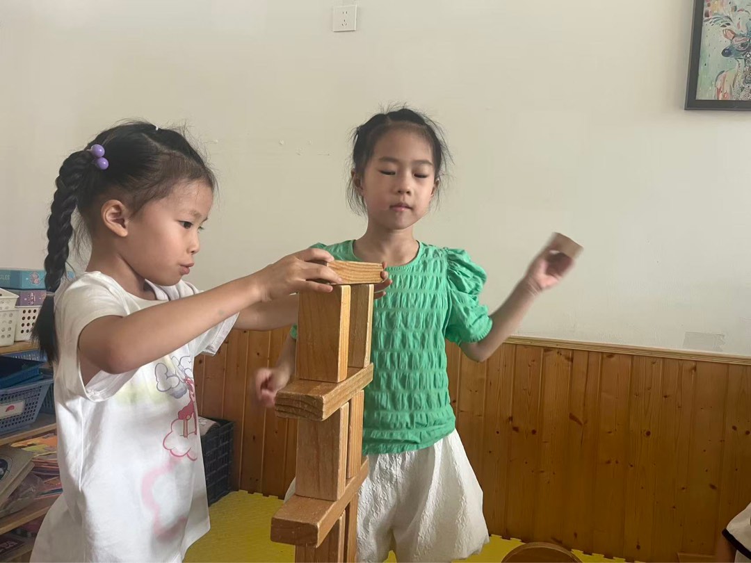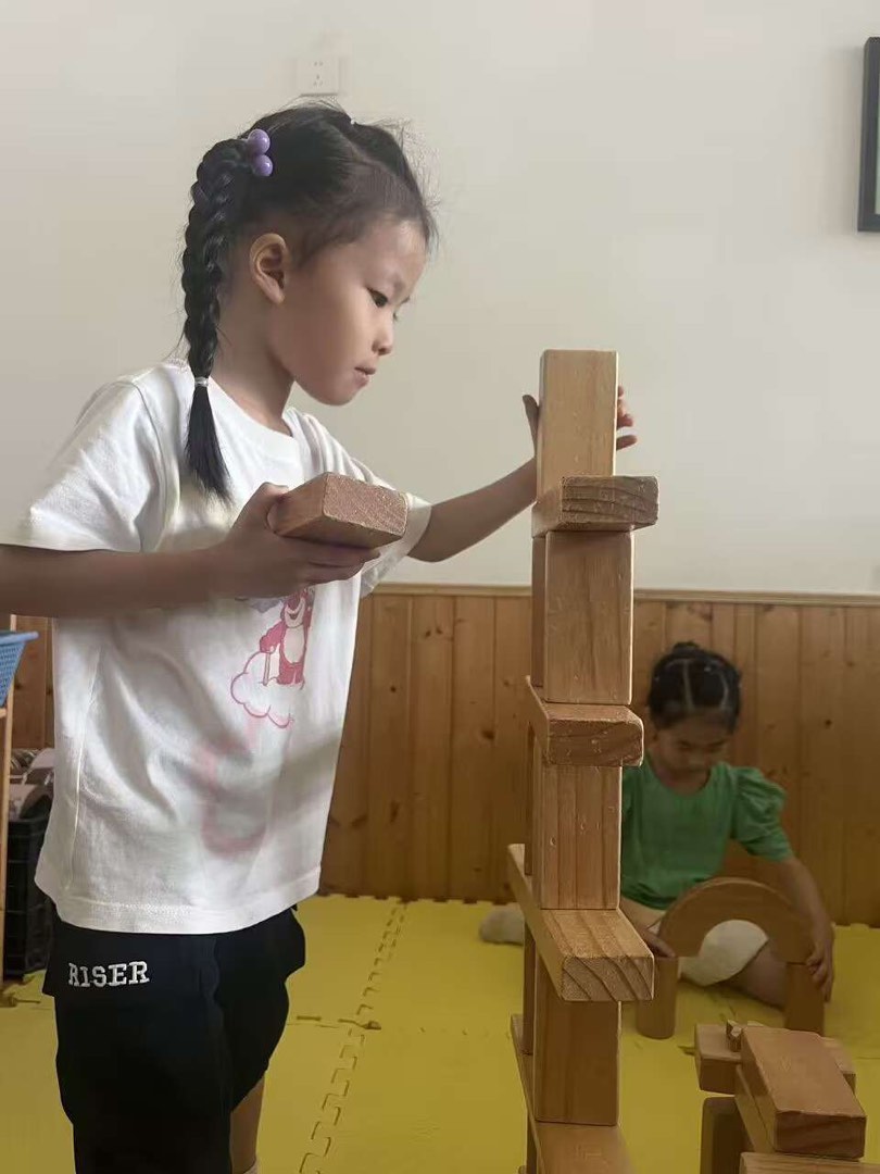 在建构区游戏中,三位小朋友化身“公园建筑师”,开启了一场充满乐趣的搭建游戏。游戏伊始,安然和果果专注地堆叠木块,精心搭建公园的“标志性塔楼”,每一次放置都透着认真。很快,在两人的默契配合中,你递木块我搭建,塔楼在她们的合作下愈发精巧。而另一边,晞晞正专注打造“公园拱门景观”,她将弧形木块与圆柱巧妙组合,两座可爱的拱门逐渐成型,仿佛在邀请大家走进这座童趣公园。在建构游戏中,孩子们不仅锻炼了动手能力与空间思维,更在合作中学会了分享与互助,用木块搭建出的不仅是公园,更是属于她们的欢乐天地与成长印记。