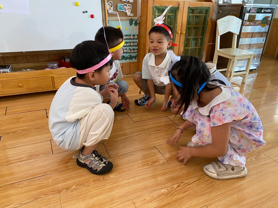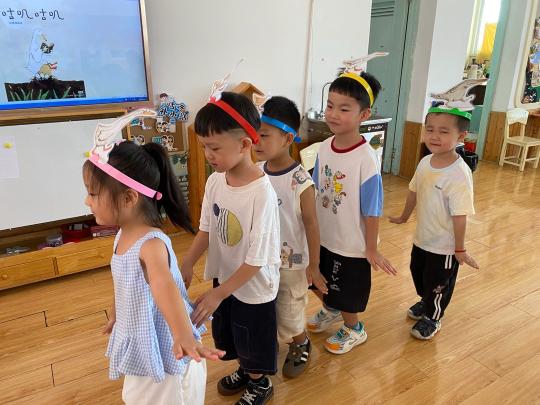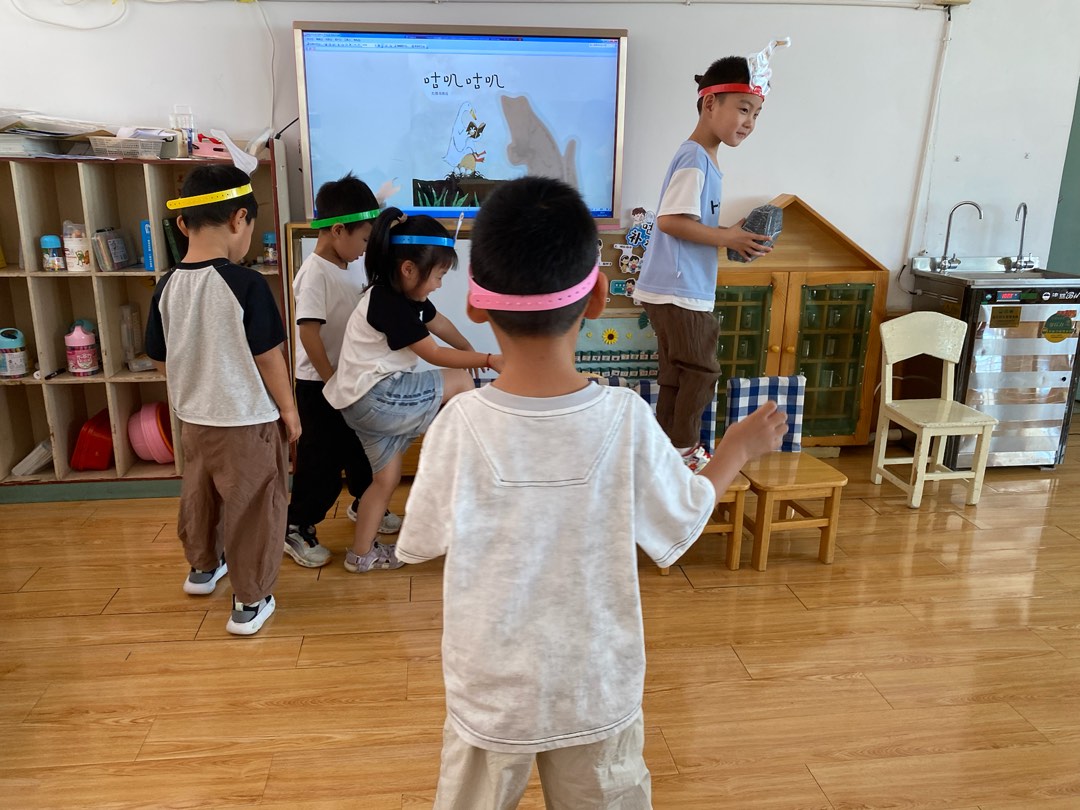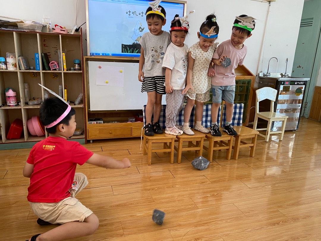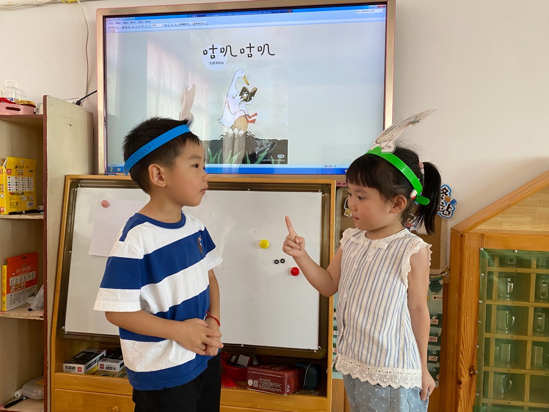 教室里一场童趣满满的《咕叽咕叽》绘本表演热闹开演。孩子们头戴自制头饰,化身绘本角色。 表演中,幼儿们借助小椅子、道具石块等,生动演绎出“咕叽”的趣味故事,稚嫩的动作与投入的神情,将绘本里的温馨与欢乐尽数传递。这场活动不仅让孩子们沉浸式理解了绘本内容,更在协作与表达中收获了成长。