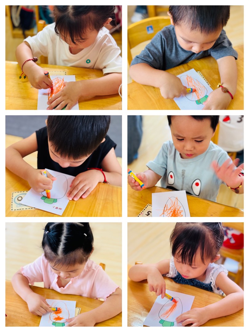 小朋友们正端坐在小桌前,专注地拿着蜡笔,在画纸上的胡萝卜轮廓里认真涂抹。他们的小脸上满是专注,握着蜡笔的小手虽然稚嫩,却饱含着满满的认真劲儿。有的小朋友小心翼翼地沿着胡萝卜边缘涂色,力求把每一处空白都填满橙色;有的则随性地挥舞着蜡笔,让橙色的线条在纸上肆意绽放,用自己独特的方式诠释着对胡萝卜的想象。