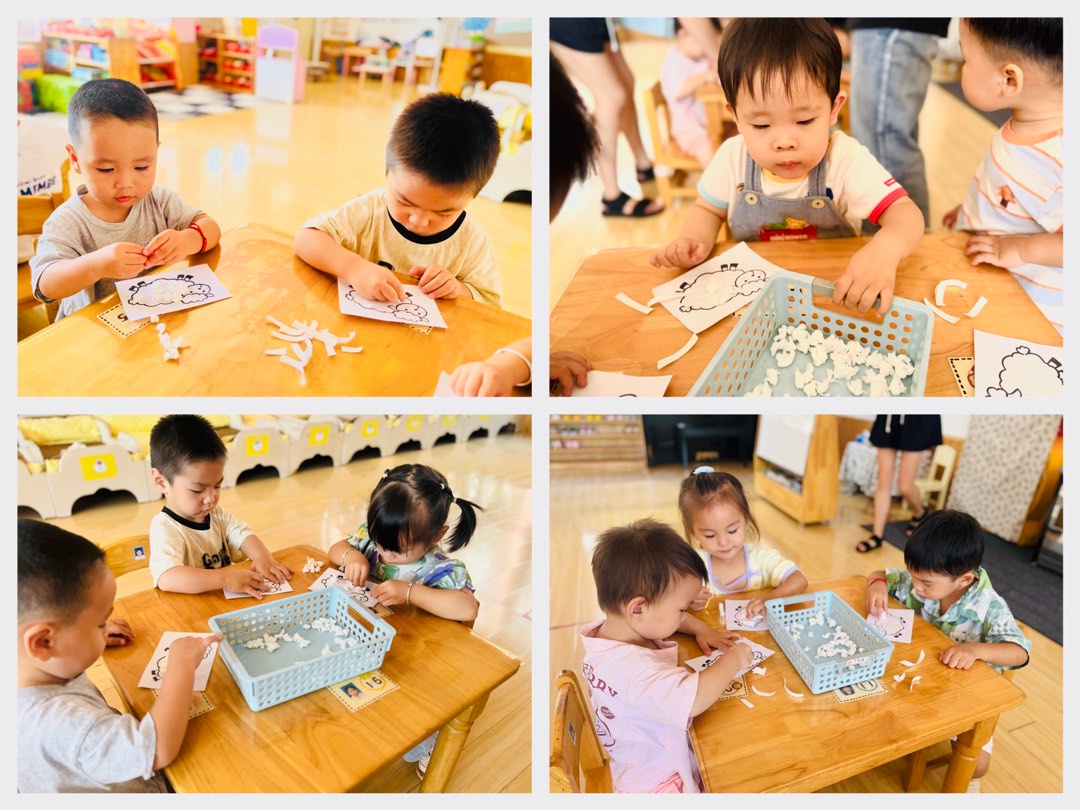 萌娃们化身小小艺术家,专注地将白色纸巾揉成一个个小纸团,然后小心翼翼地黏贴在画有绵羊轮廓的卡纸上。他们稚嫩的小手虽不那么灵活,却满是认真,有的低头仔细揉着纸团,有的专注地将纸团粘在绵羊身上,教室里充满了他们的欢声笑语。 经过一番创作,一只只原本只有轮廓的绵羊,被孩子们用白色纸团“织”出了蓬松的“羊毛”。这些作品被展示出来后,形态各异的“绵羊”们仿佛在“比美”,每一只都凝聚着孩子们的创意与用心。 此次活动不仅锻炼了托班幼儿的手部精细动作,还激发了他们的艺术创作兴趣,在趣味操作中感受手工创作的快乐,体验到成就感。