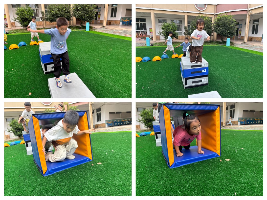 秋日的幼儿园户外草坪上,孩子们正开启一场充满活力的体能探险。只见孩子们在彩色体能器材间穿梭:有的如小勇士般跨越障碍墩,双脚腾空的瞬间尽显矫健身姿;有的在分层器材上稳稳站立,锻炼着平衡感;还有的钻进软包隧道,手脚并用地爬行,每一次探索都充满专注与欢乐。这些体能活动不仅让孩子们在跑、跳、爬、钻中锻炼了肢体协调性与大肌肉群力量,更在集体运动中培养了勇敢、坚持的品质。同时让孩子们在欢笑中收获健康,在挑战中突破自我,为童年时光注入满满活力。
