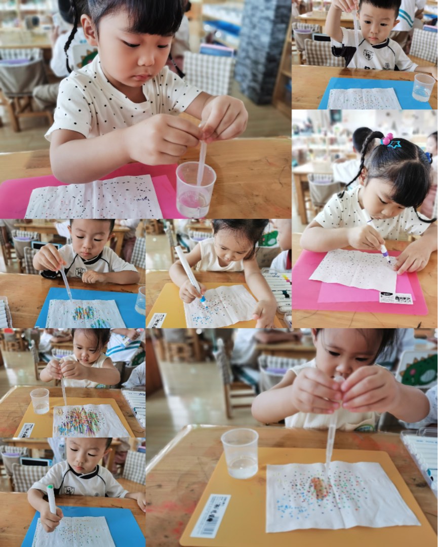 在幼儿园的科学角,一场奇妙的“烟花”实验正在上演。孩子们手握丙烯笔,在洁白的纸巾上轻轻点点,红的、蓝的、黄的……彩色的圆点像散落的宝石。紧接着,他们拿起滴水管,小心翼翼地将水滴在圆点上。 神奇的一幕发生了!彩色的圆点像被施了魔法,顺着纸巾的纤维向四周“绽放”,渐渐晕染开,变成了一朵朵绚烂的“烟花”。这是因为纸巾的纤维结构具有吸水性,丙烯颜料在水的带动下发生扩散,就形成了这样美妙的视觉效果。 孩子们睁大好奇的眼睛,感受着科学与艺术的碰撞,在动手操作中探索水的毛细现象,在五彩斑斓的“烟花”里,种下了对科学探究的兴趣种子。