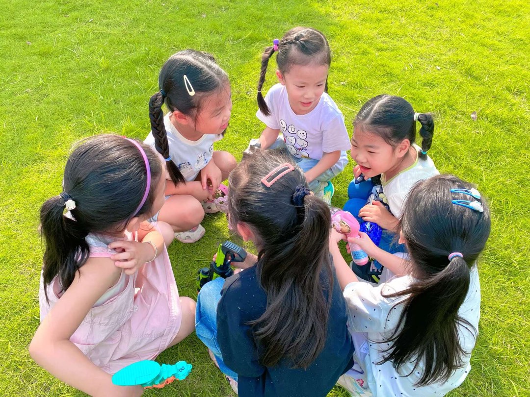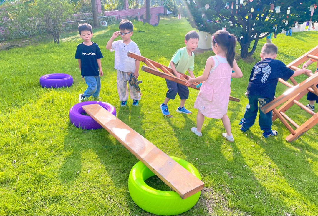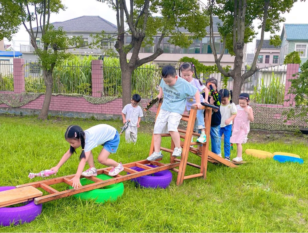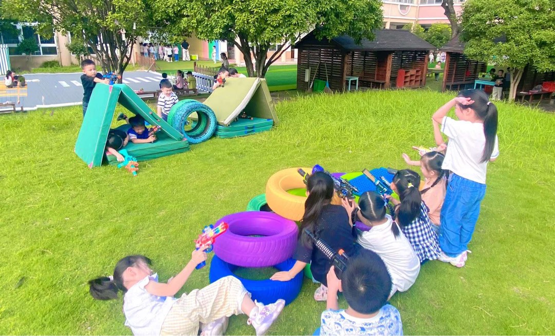 在山坡上,迎来了小朋友们期待又欢喜的野战游戏。瞧,小朋友化身“工程小队”,运用轮胎、木板等材料来搭建训练场。紫色和绿色的轮胎稳稳托住木板,构成简易却充满挑战的“训练场”;木质梯架在他们的巧手下,成为“训练场”的关键组成。小朋友们分工明确,在动手实践中锻炼了空间思维与团队协作能力。而另一边,几位女孩子围成一圈,正兴致勃勃地商量游戏计划。她们手持彩色玩具枪,你一言我一语,时而低头交流,时而露出俏皮笑容,在讨论中明确角色分工、规划“作战”策略,把对游戏的期待融入每一个细节的构思里,展现出细致的规划力与默契的沟通力。随着“战场”搭建完毕、计划敲定,“抓坏人”的游戏正式拉开帷幕。孩子们手持玩具枪,在草坪上奔跑、穿梭,有隐蔽、有突击,玩得不亦乐乎。他们在角色扮演中释放活力,在追逐嬉戏中学会合作与应变,草坪上回荡着阵阵的笑声。这场“野战区”游戏,不仅是孩子们释放天性的舞台,更是他们在实践中提升创造力、协作力的成长课堂。