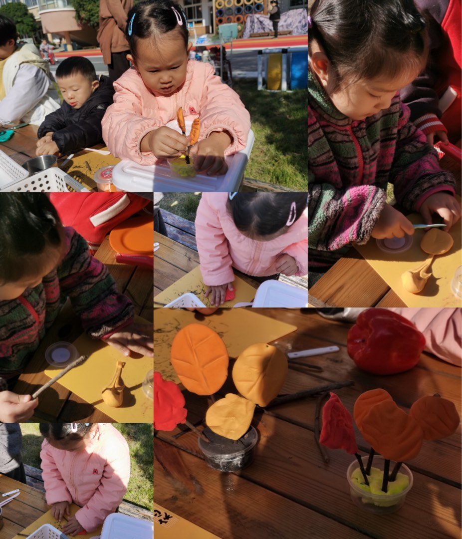 红的似火、橙的如霞、黄的像金,一片片黏土叶子在孩子们手中诞生,再与树枝结合,插进“花盆”,成了独一无二的秋日盆景。他们在游戏里触摸秋天的质感,用黏土定格季节的色彩,让户外游戏区成了充满童趣的秋日艺术工坊,每一片黏土叶都藏着他们对秋天的奇思妙想。