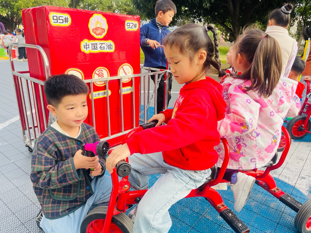 不远处的“加油站”更有趣——红色纸箱做成的“中国石油”加油机上,贴着“95#”“92#”标识,周艺琪在指挥员的引导下骑着车刚“加油站”,举着玩具加油枪的隽隽就凑上来,有模有样地“加油”。