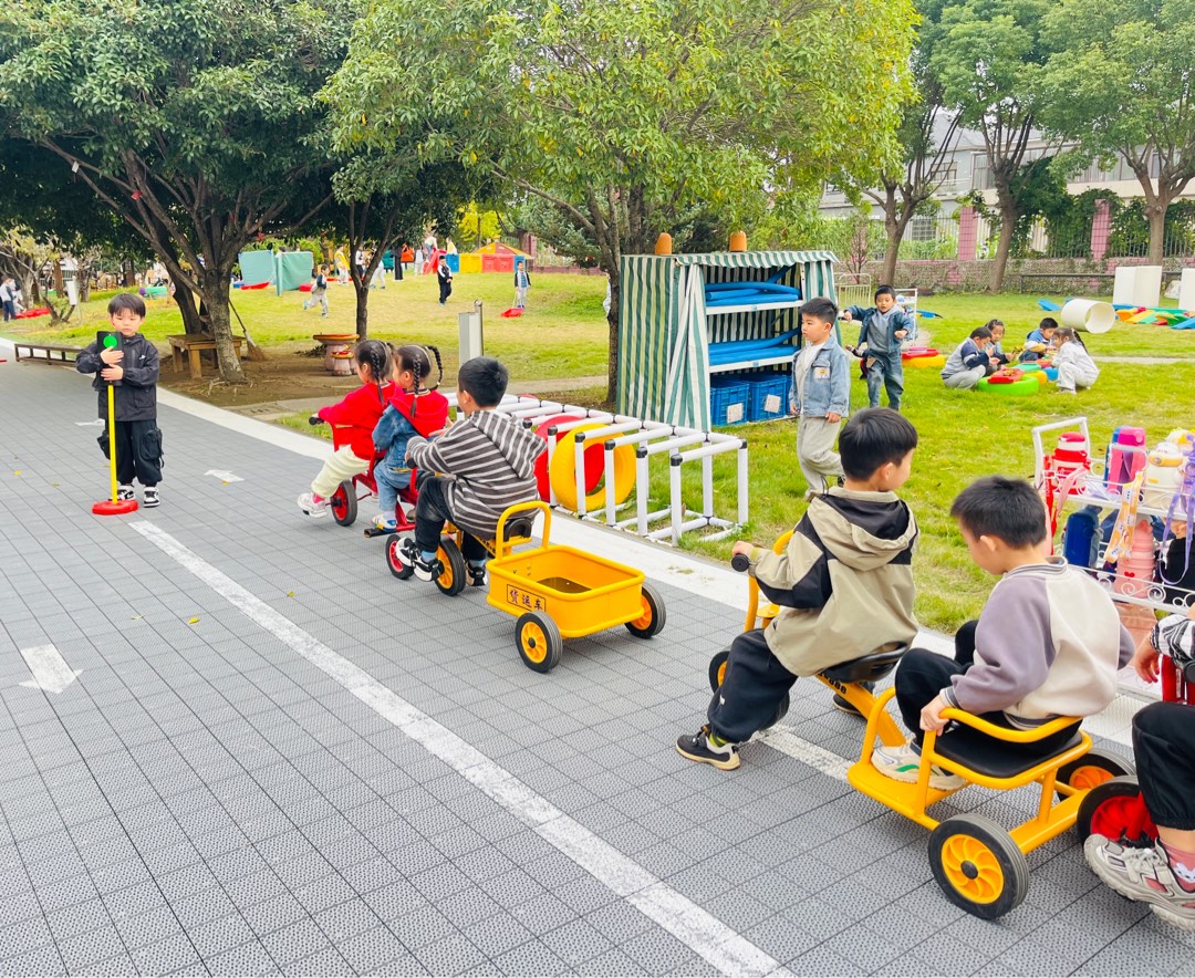 秋日的幼儿园草坪边,大班的“马路”上正上演着热闹的交通游戏:红、黄两色三轮车排起“车队”,车头还挂着写着“货运车”的小拖斗,鲁严举着“红绿灯”站在路口,小司机们乖乖等着“放行”。
