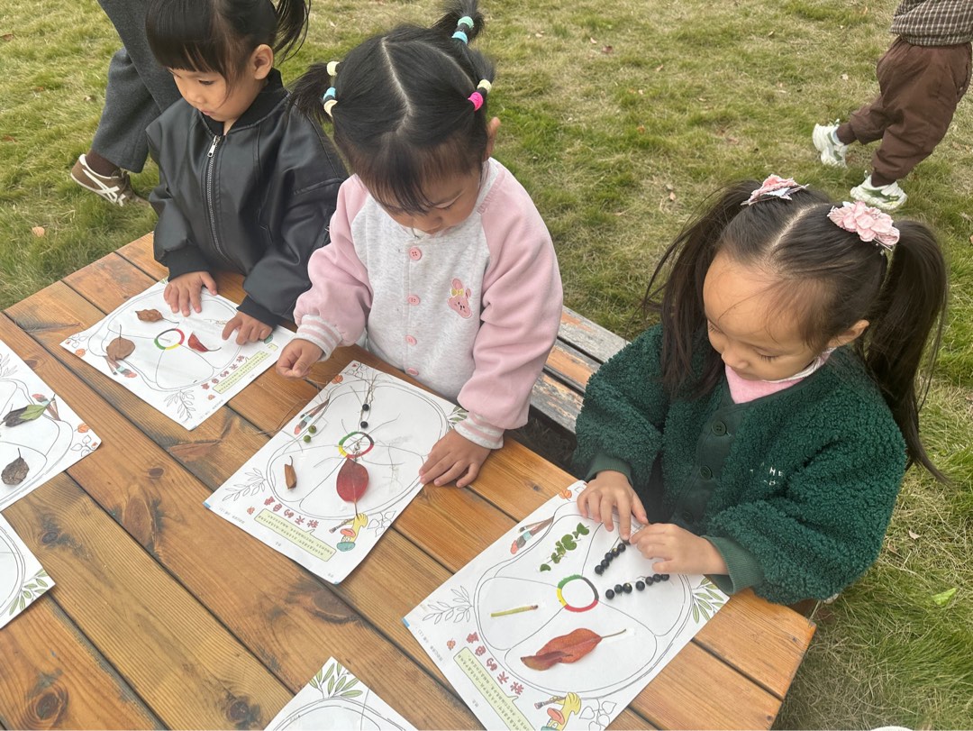 宝贝们在户外的草地上围坐在木桌旁,认真地将收集到的落叶和浆果拼贴在画纸上,创造属于自己的“秋天色盘”。