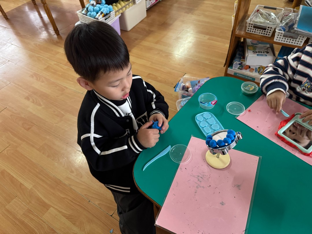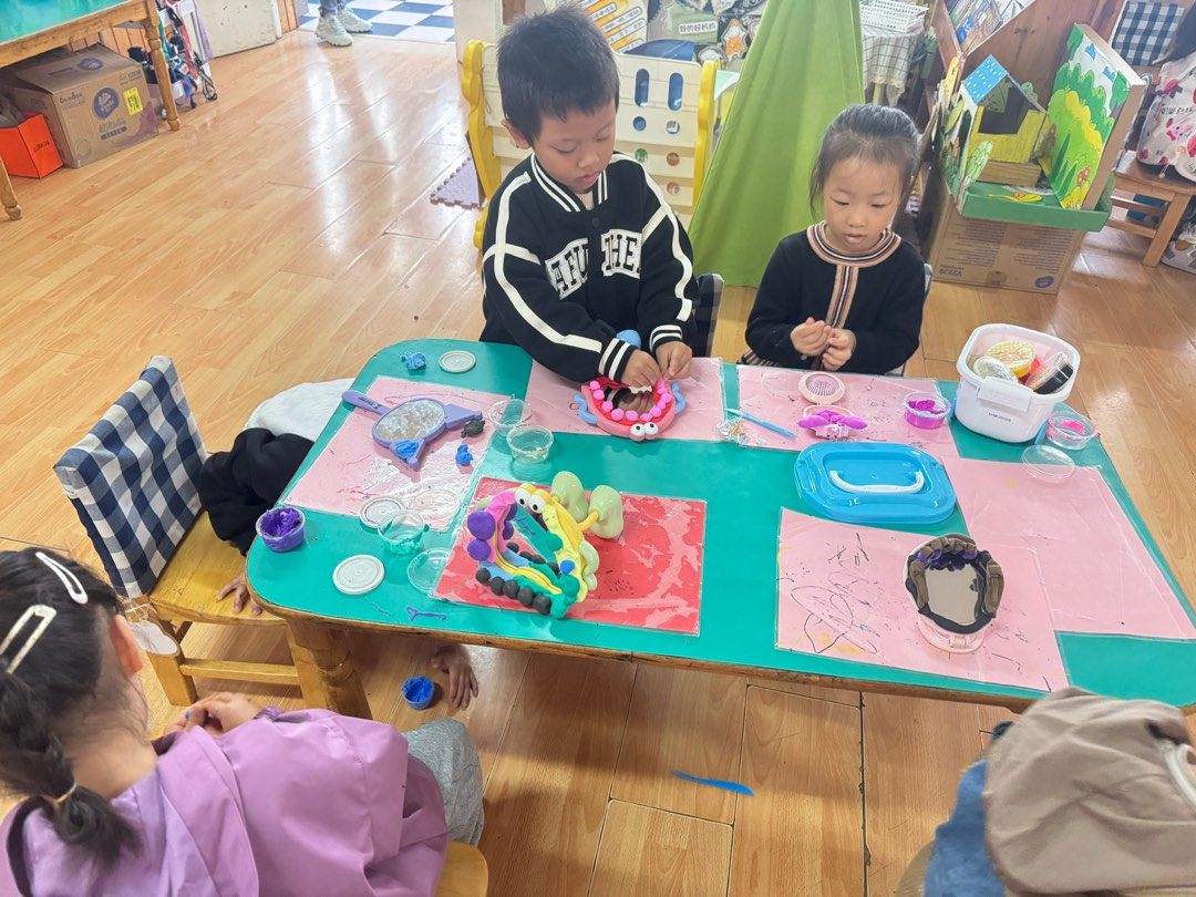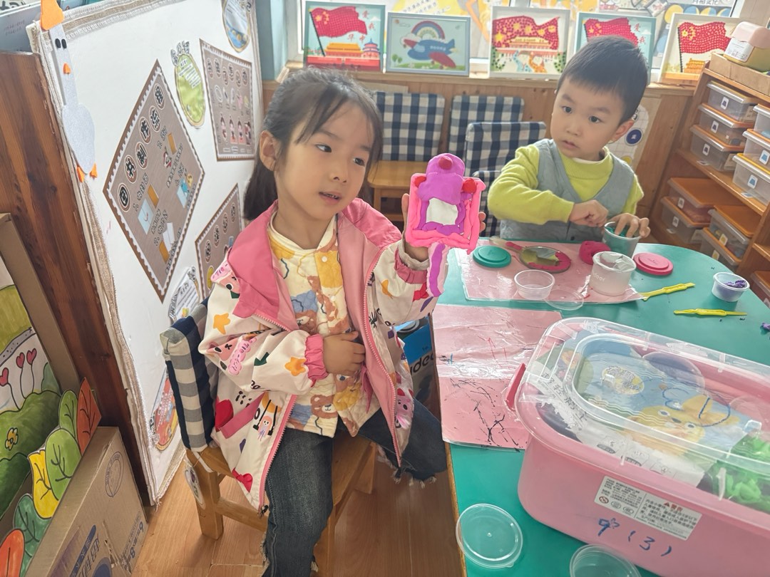 只见小朋友们围坐在子旁,手里捏着彩泥、小工具,认真地给镜子做装饰。浩宇把蓝色彩泥搓成圆滚滚的小球,粘在镜子边缘排成“项链”;洋洋做出了粉粉的“小牙齿”造型,让镜子变成了可爱的卡通笑脸;魏少溪用紫色彩泥捏出立体的小装饰,举着成品开心地展示。