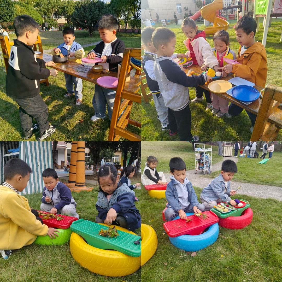 草坪上,户外自主游戏正热闹铺开。长木桌旁,孩子们踮脚递着彩盘,捏着叶片、果实当“食材”,把想象煮进小碗;不远处的轮胎“灶台”边,几个身影蹲成一圈,将落叶铺作“菜肴”,塑料铲碰得轻响。滑梯的影子斜斜覆在草地上,远处的脚步声混着笑,成了这场游戏的背景音。没有预设的剧本,只有小手摆弄自然物的专注——风裹着草香,把童年的自在揉进每一个低头摆弄“美食”的瞬间。