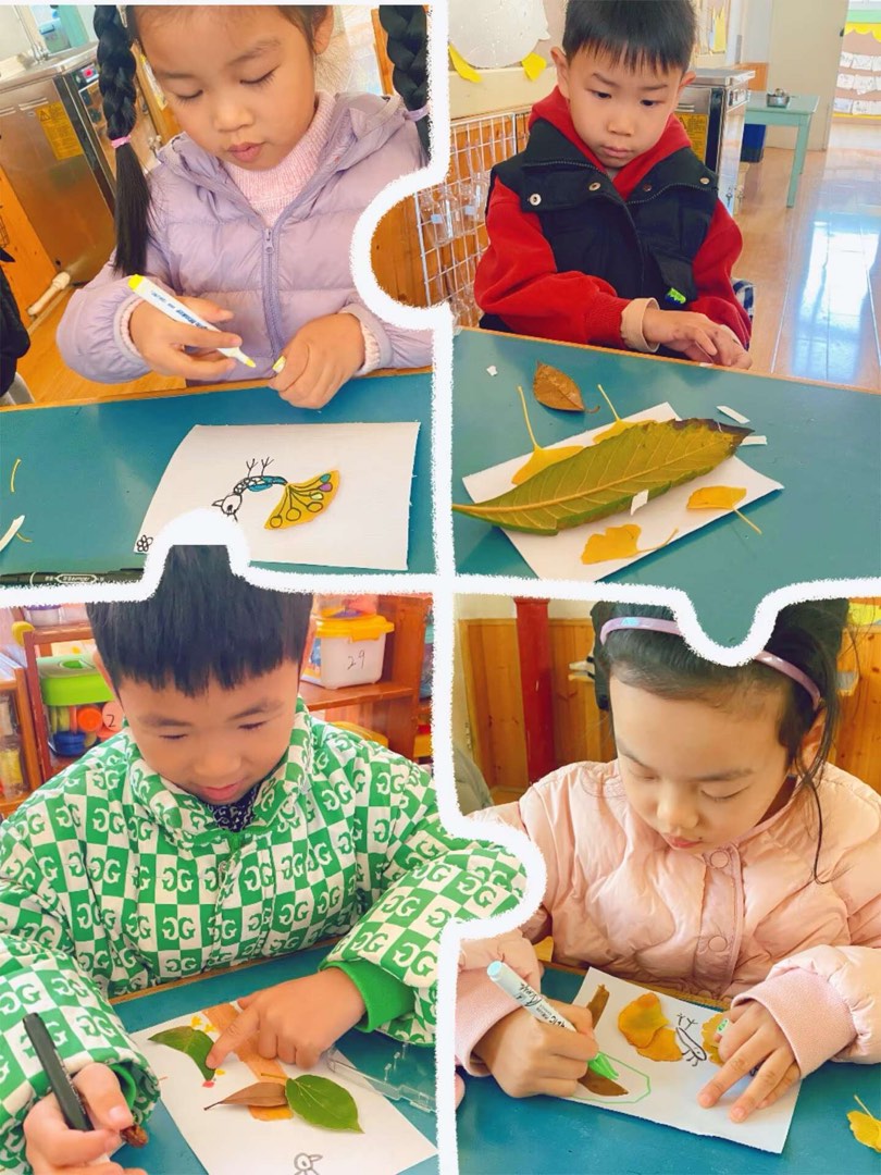 在秋天的主题活动时,我们与幼儿一起收集了不同的落叶,开展了一次“落叶畅想”的活动。活动开始,小朋友们便各自选择了自己心仪的落叶后,立刻投入到了创作中。有的将银杏叶当成了孔雀的尾巴,用彩笔添上了灵动的身体,栩栩如生。有的把宽大的叶子变成了“小船”,搭配了小树叶做船桨”。还有的组合了不同的落叶,创作出了可爱的小动物。原本普通的落叶在幼儿的奇思妙想下,变成了一幅幅充满童趣的作品。而此次活动不仅让幼儿感受了秋天的自然之美,更让“自然材料”成了激发幼儿创造力的鲜活载体,让幼儿在与自然的互动中,收获了创意与快乐。