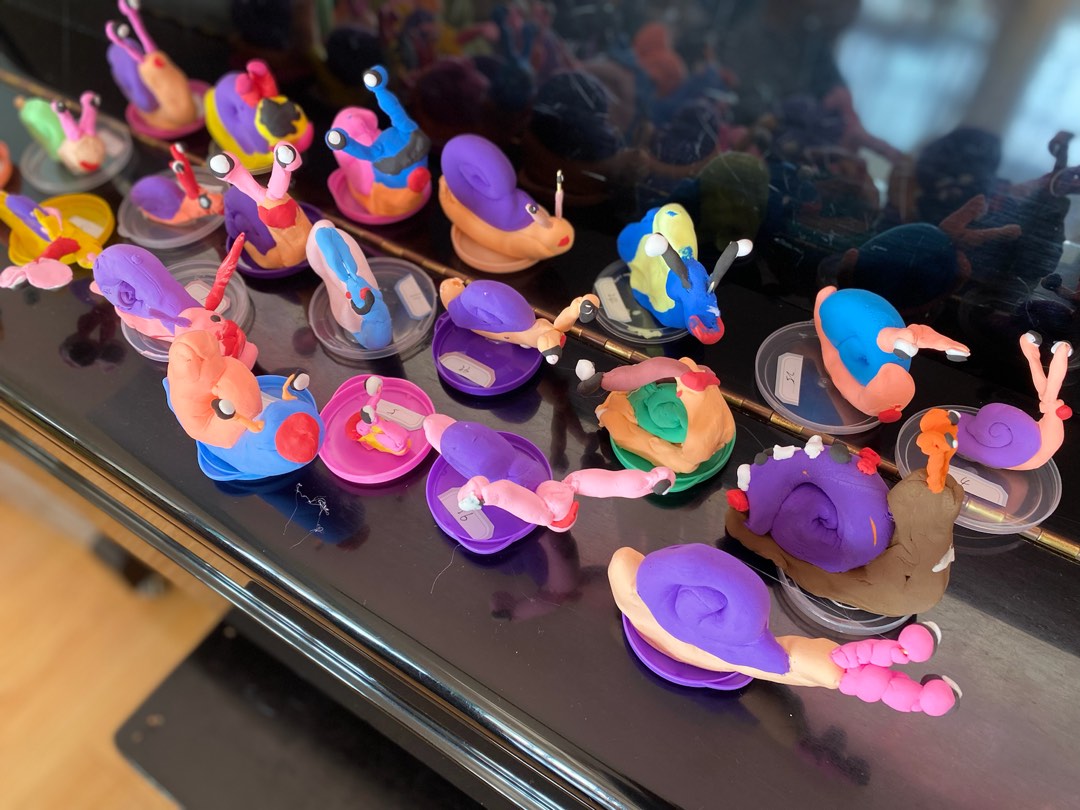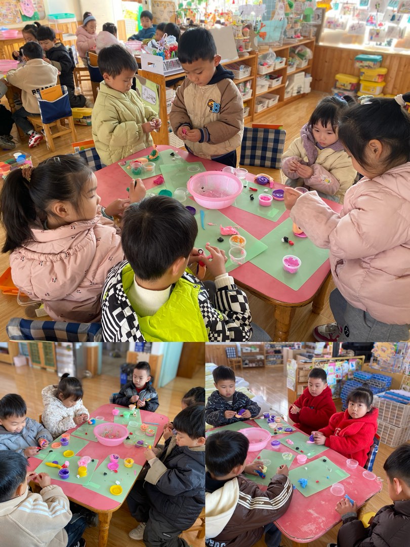活动中,孩子们围坐在桌前,专注地摆弄着彩泥。他们先揉出圆圆的蜗牛身体,再搓出螺旋状的壳,又用牙签包裹住彩泥捏出细细的触角,还发挥想象给蜗牛搭配上粉、紫、蓝等缤纷色彩。