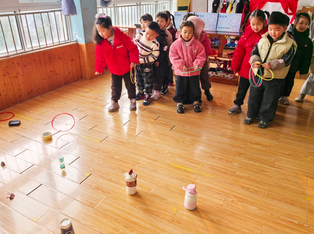 班中开展了趣味套圈游戏活动,孩子们用彩色套圈挑战水杯、沙漏等日常小物件,在玩闹中收获满满快乐。