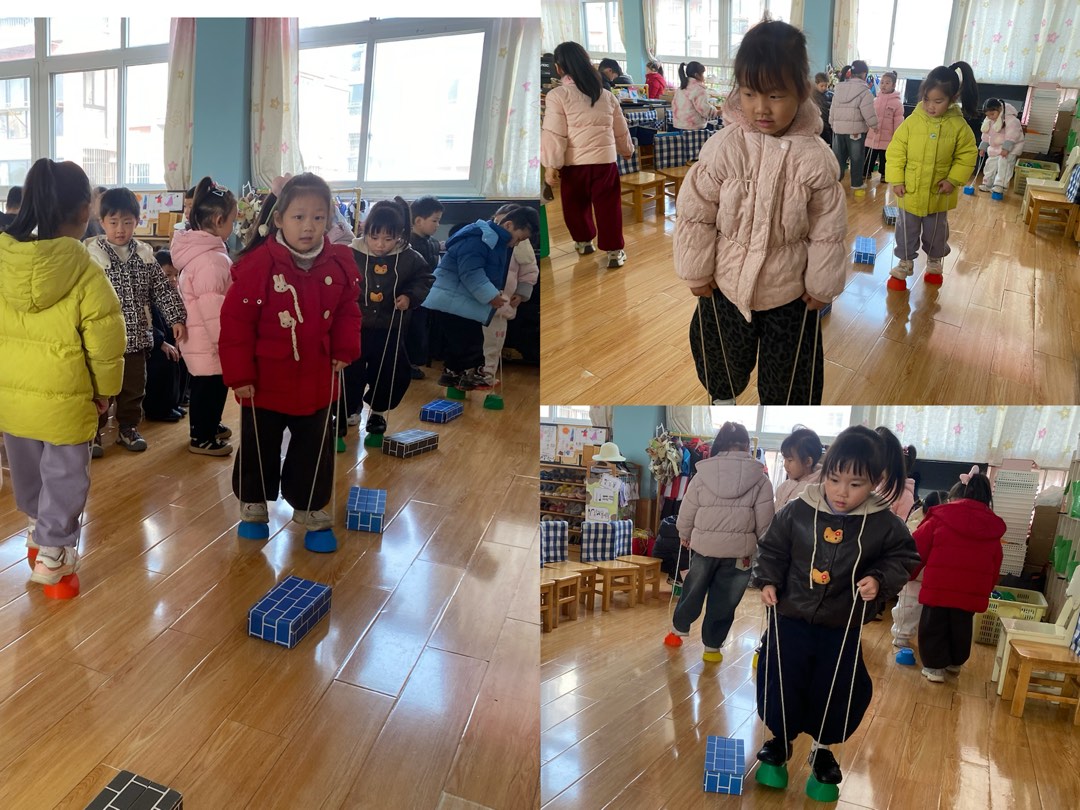 因特殊天气,幼儿园取消户外活动,转而开展室内小型器械趣味活动。室内,绿色小圈、纸质积木块、踩高跷、纸球等器械等按活动区域有序摆开,瞬间成为孩子们的欢乐阵地。