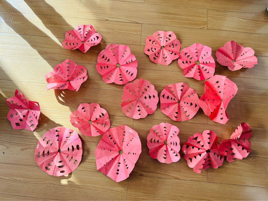 活动开始时,我们先通过照片给孩子们展示了各种各样漂亮的窗花作品。随后,孩子们领到了正方形的红纸,跟着步骤图,一步一步地把它折成了一个小小的“三角形”。接着,他们拿起小剪刀,认真地沿着边缘剪着弧线。有些孩子还在中间,小心翼翼地剪出了几个小口子。剪好后,孩子们轻轻把折好的纸展开——哇!奇迹发生了!一张普通的红纸变成了一朵美丽的窗花!孩子们看着自己的作品,又惊又喜,开心地举起来给小伙伴们看。