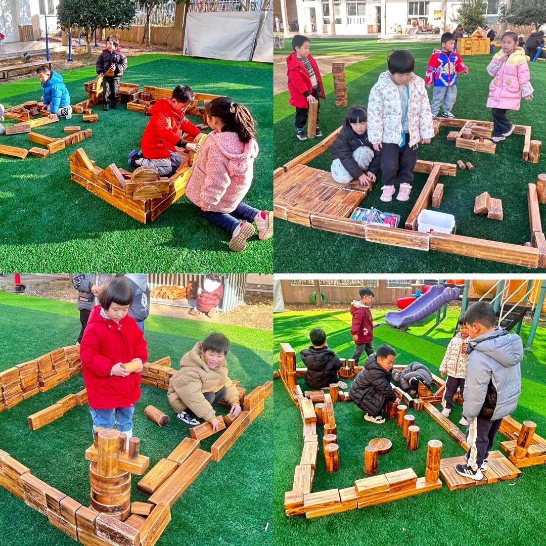 冬日暖阳下,孩子们围在一堆木质积木旁,开始了户外自主游戏搭建。他们分工合作,有条不紊的搭建着。有的孩子专注地挑选积木,根据形状和长短规划搭建轮廓;有的孩子两两配合,合力将大块积木拼接成“围墙”和“地基”;还有的孩子发挥想象,用圆柱积木搭建出“立柱”,用长条积木拼出创意十足的造型。从方形的“小房子”到造型别致的“小城堡”,再到充满童趣的“小桥”,一块块普通的积木在孩子们手中变成了各式各样的作品。过程中,孩子们不时交流想法,调整搭建方案,遇到积木不稳的情况,还会一起讨论解决办法,在实践中锻炼了动手能力和合作意识。