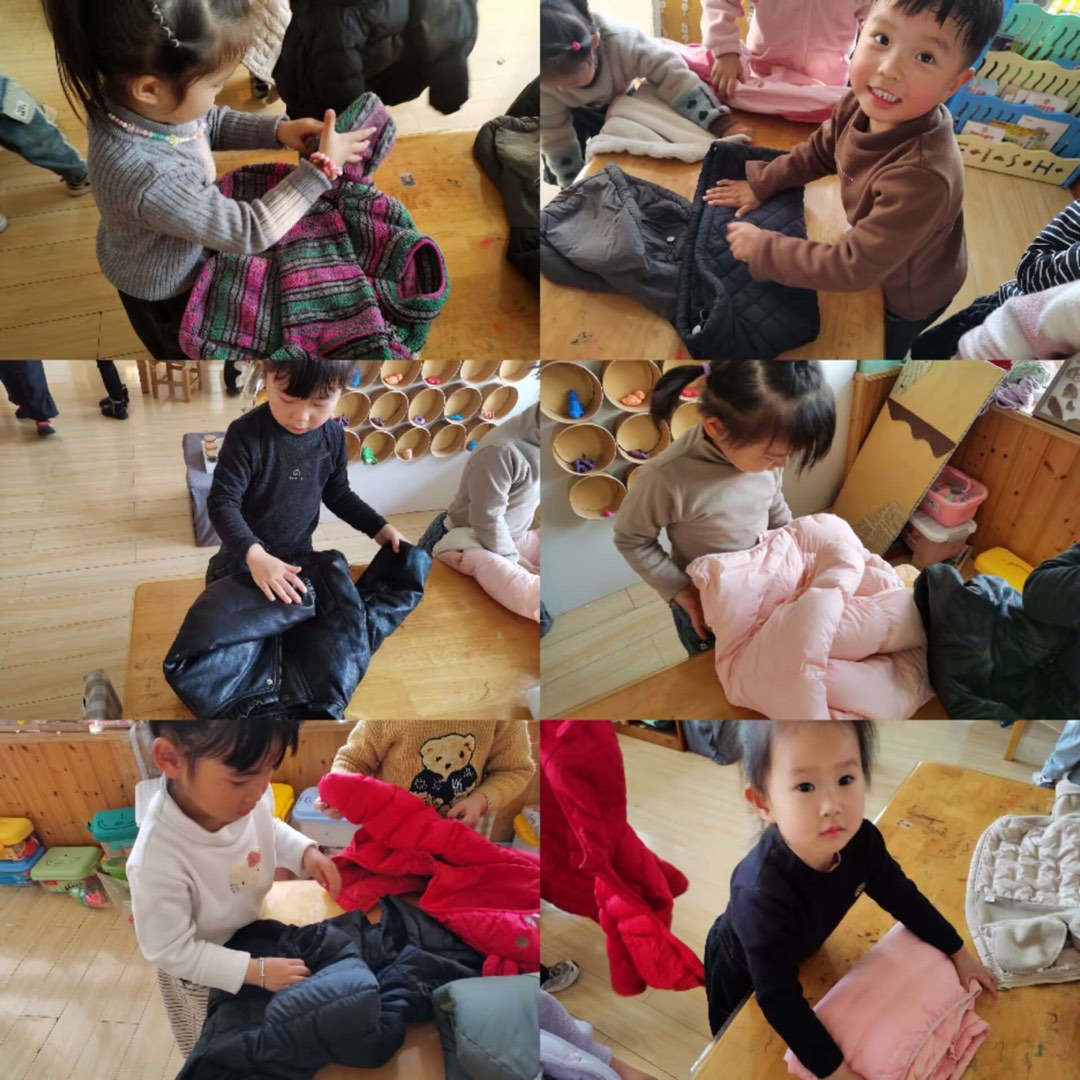 最近天气有点暖和,孩子们户外活动后脱掉的外套总是散落一地,乱糟糟的模样让我们萌生了教孩子们叠衣服的想法。小班第一学期的宝贝们,别看年纪小,学起本领来却格外认真。 孩子们小手忙个不停,抻平衣角、对折袖子、整理领口,一步一步学得有模有样。从一开始的手忙脚乱,到慢慢能独立把衣服叠得整整齐齐,看着自己叠好的衣服,孩子们脸上满是成就感。这小小的叠衣服技能,不仅让班级变得整洁,更让宝贝们迈出了自主自理的重要一步!