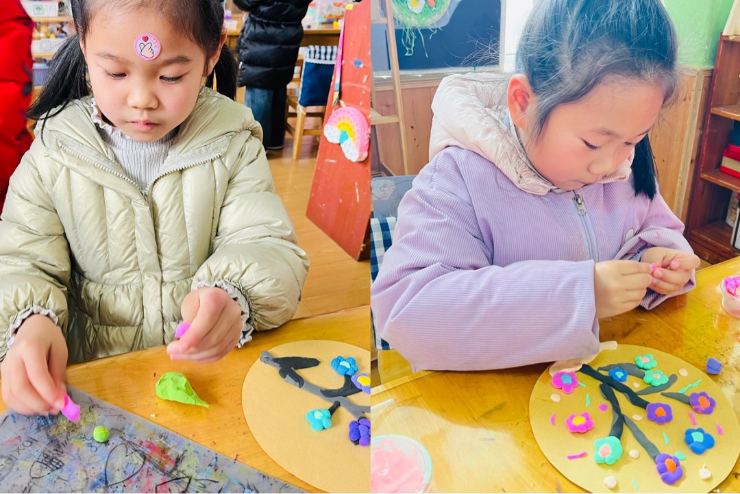 手工活动不仅锻炼了孩子们的手部精细动作,更让他们在动手过程中感受到了制作的美好,用彩泥把花朵“捏”进了教室里。