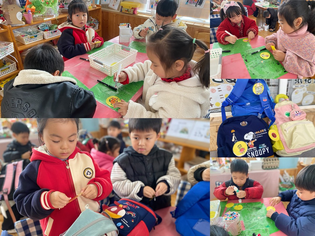 新学期第一天,中班教室里热闹又温馨,孩子们正在亲手制作专属的新年书包挂件。